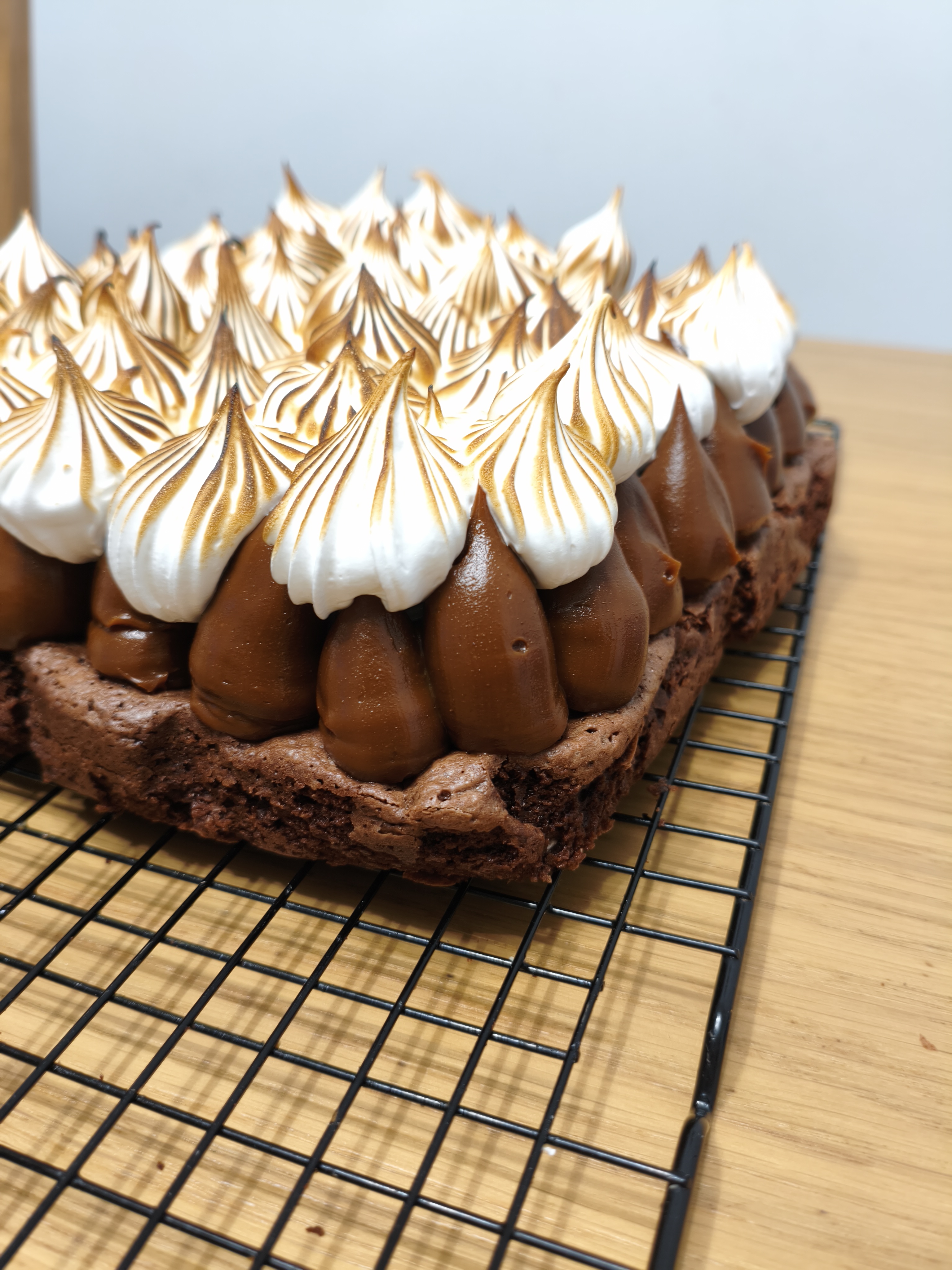 Torta brownie cubierta con dulce de leche y un delicioso merengue.